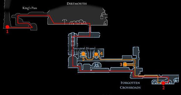 到这一步我们已经可以下远古盆地拿黑冲刺和黑尖啸了,但是远古盆地的地图没啥好画的我就在这里简单说一下难点:远古盆地下面唯一的难点就在于灯塔处的“兄弟”,这玩意摸一下就是两血,所以一定要在发现刷了黑影时就在台阶上等他们近身送人头,清干净再走,以免发生跳跃的时候翻车的情况。