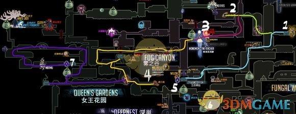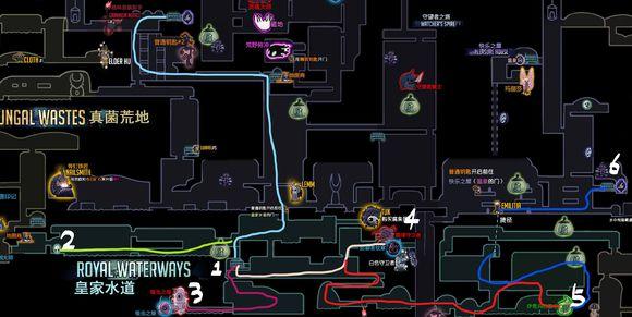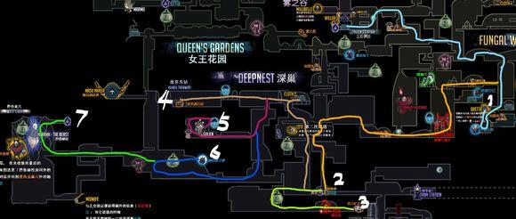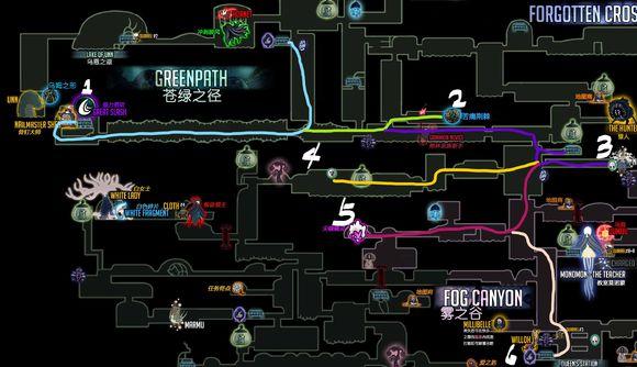 注意:这里我们需要走的雾之谷水母和女王花园的叛徒领主都是两格伤害,而如果没有特意收集面具碎片的话我们现在应该是6血(小迷妹的一个,王后车站一个,无眼一个,下水道一个),想要提高容错率的同学可以再跑跑地图,收集一下十字路口的两个面具碎片(毛里克和温泉下方地图),再在Dirt Mouth买两个就有7血了,走起来会稳一点。