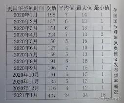 这张图是蓬佩奥推特发文的频率,我们可以分析看看频率的变化:2020年1月份,他发了198条,2月份157条,3月份154条,4月份224条,5月份150条,6月份127条。2021年1月份还没过完,过了一半多一点,今天录制节目的时间是1月18号,是美国时间1月17号,一共是407条,基本上翻倍,2倍或者是3倍,甚至是4倍的频率。