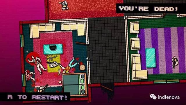 游戏的战斗系统和思路基本上就是这样了,光看这些的话我自己都觉得这好像是个战术嵌入动作游戏。但事实上 Hotline Miami 把整个游戏的节奏调整到了一个令人“上头”的感觉上。你和敌人的移动速度都非常快,移动一横屏幕的距离两秒内就能完。敌人的反应有个明显的反应时间设定。在反应时间内敌人不会做出任何动作,但之后持近战武器的敌人会加速冲向你,而拿枪的敌人会瞄准着你开枪,而且是瞄的非常准基本上玩家是没法躲的。对于背对着你的敌人和巡逻的敌人这个反应时间大概有半秒左右,而对于某些面朝你站着的敌人这个反应时间短到基本是一瞬间。总而言之你和敌人互相在视野范围内的话,基本上只有不到半秒左右的操作时间,在这其间你需要迅速的移动并作出动作。近战武器攻击判定只有一瞬间且有短暂的 CD。面对多个敌人的时候你需要在半秒内高速移动并配合有节奏的多次点击鼠标左键。如果有敌人冲向你的话,你需要倒退并且算准武器的极限距离按下攻击,不然就会被弄死。拿枪的话,你要绕出墙角开一枪就马上闪回来,很多情况下你会发现你刚好闪开敌人打过来的子弹。我感觉 Hotline Miami 把游戏的节奏调整到了光靠反应已经来不及的程度:你没法躲开比你移动速度快三四倍的子弹,也没法直面瞬间回头一棒子就抡到你的敌人。你总是需要在这一个墙角,在这一扇门前策划好,你要如何冲出去用球棒甩死两个那边的两个人,你要如何推开门扫射打死对面的两个带枪的。等你开始动的时候,反应的部分已经很少了。游戏里对玩家的死亡没有实质的惩罚,死了的瞬间就可以按 R 重新开始,唯一糟糕的就是会看到自己控制角色跟敌人同样惨烈的死态。