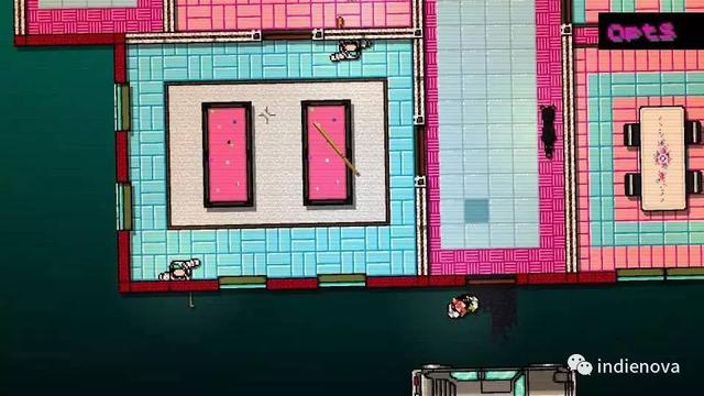 所有人都喜欢好莱坞枪战片,在游戏里尝试复现火爆的动作场面的游戏也不少,但真的能在游戏流程中而不是过场动画里让你感受那种暴躁的感觉的的真不多。这方面 Hotline Miami 应该是一个成功的例子。回头看一下上面的截图,这一关开始你必须做的是等通道里的狗走开,冲进左边的房间,捡起台球桌上的球杆甩倒上面的敌人,之后用剩下的半截球杆丢死远处的敌人,再捡起敌人掉落的球棒,按空格键骑在挣扎的敌人身上,猛击左键把他的头砸烂。游戏中很多关卡开场处都是这样的故意的设定,比如进门一拳打晕看门的守卫,捡起他只有两发子弹的散弹枪,接着你要一发打死一个从两边冲过来的重型敌人。