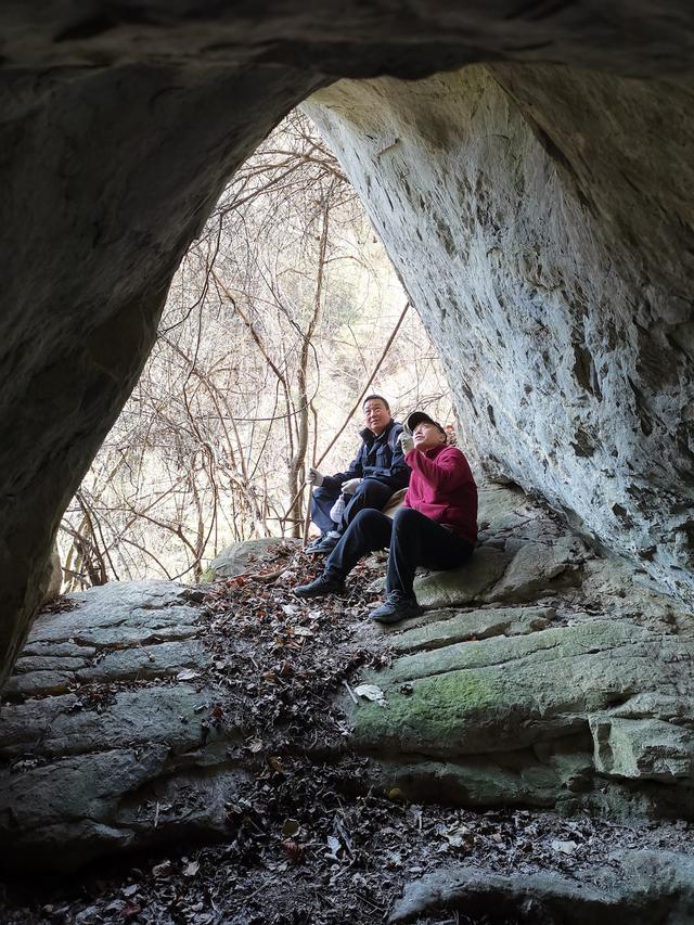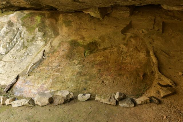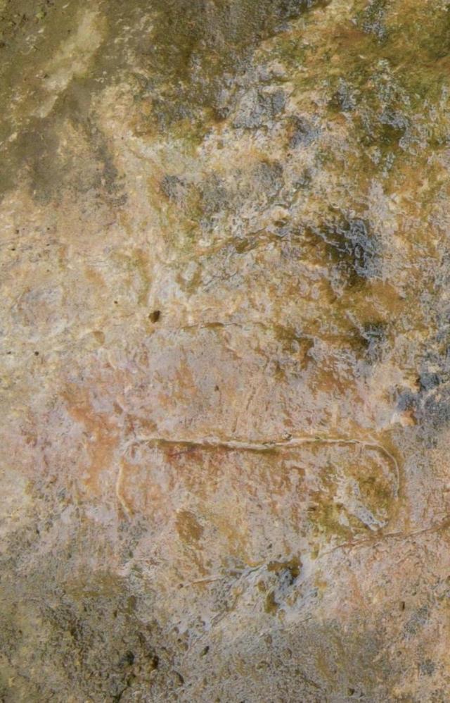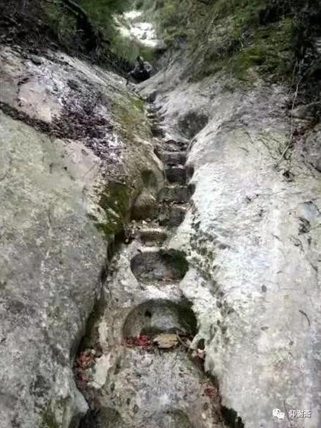 在岩画西北约30余米的山谷沟漕中发现马蹄状凿孔70多眼,沟漕上段有30余眼,下段约40多眼,孔径20至25厘米,间距15至50厘米,深约20至30厘米,有的底部凿有一个或两个大小不一的小穴(见图22)。这些马蹄形孔眼估计为古人浮选矿石时所留遗迹。距岩画南约40米的河岸巨石上凿有宽0.5米,长8米的古径一段(见图23),又在岩画南约20米的东侧崖壁中部发现一烧凿的连体双洞,洞高4米,宽3米,深约6米,南洞略低北洞,北洞末端有石台炕,可容四五人寝息,洞内通风采光俱佳。洞口便径上可至峰顶,下可至河谷。此洞应为古人居住用。(见图24)