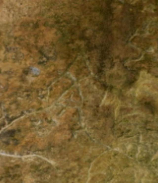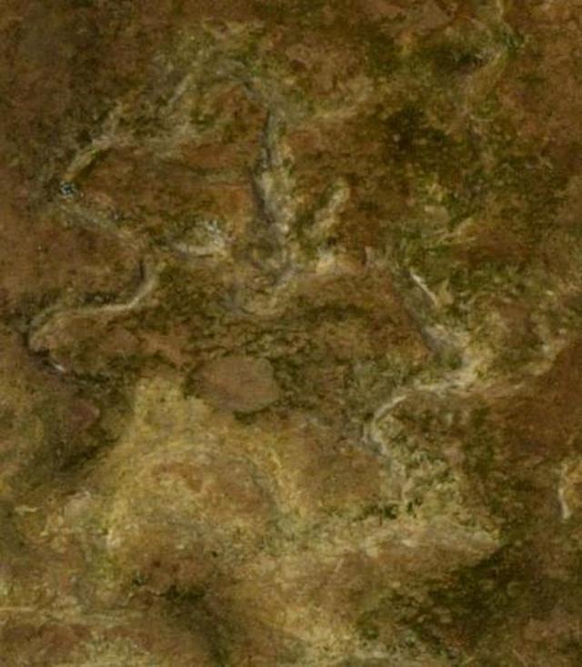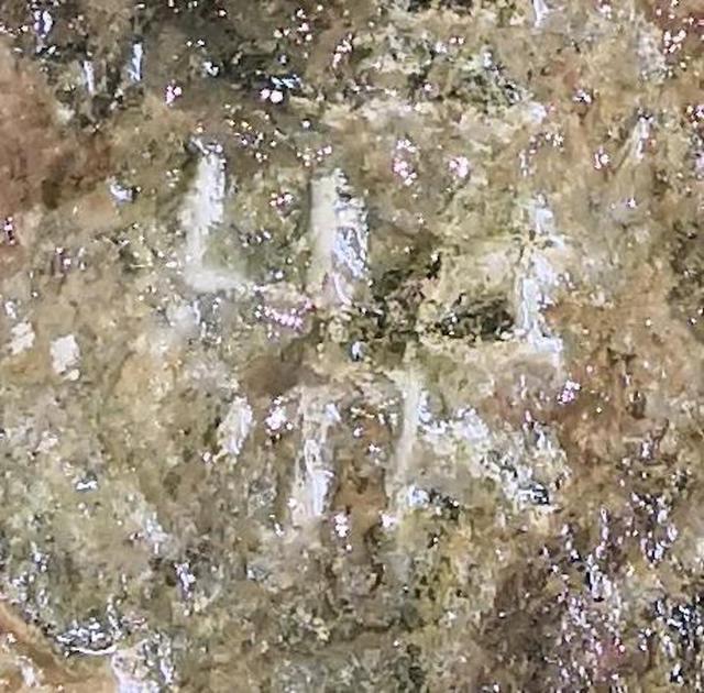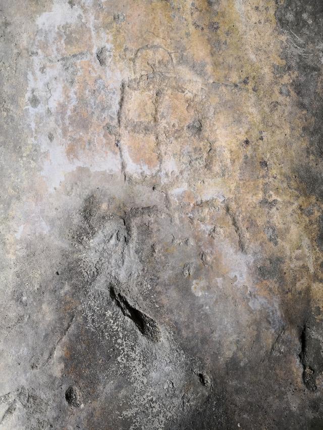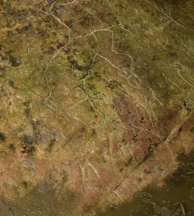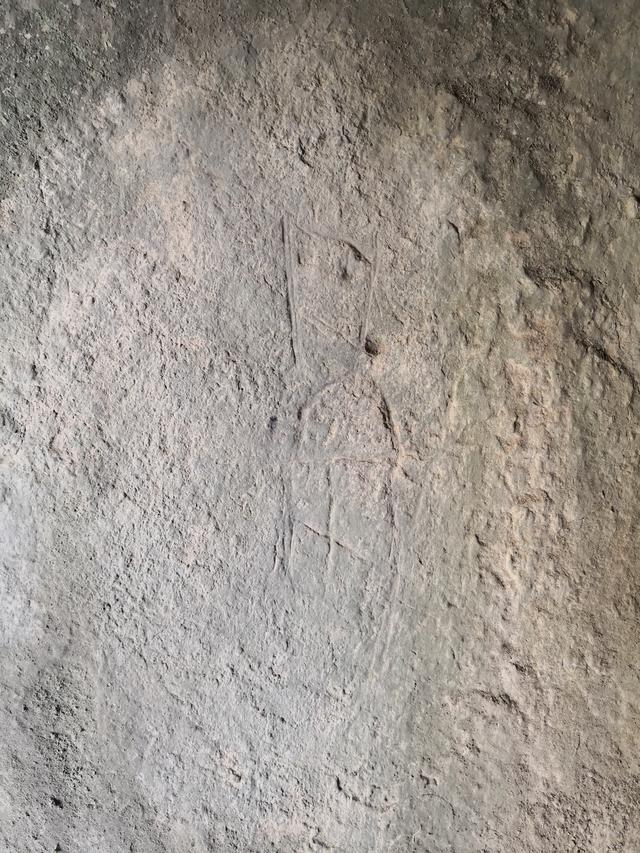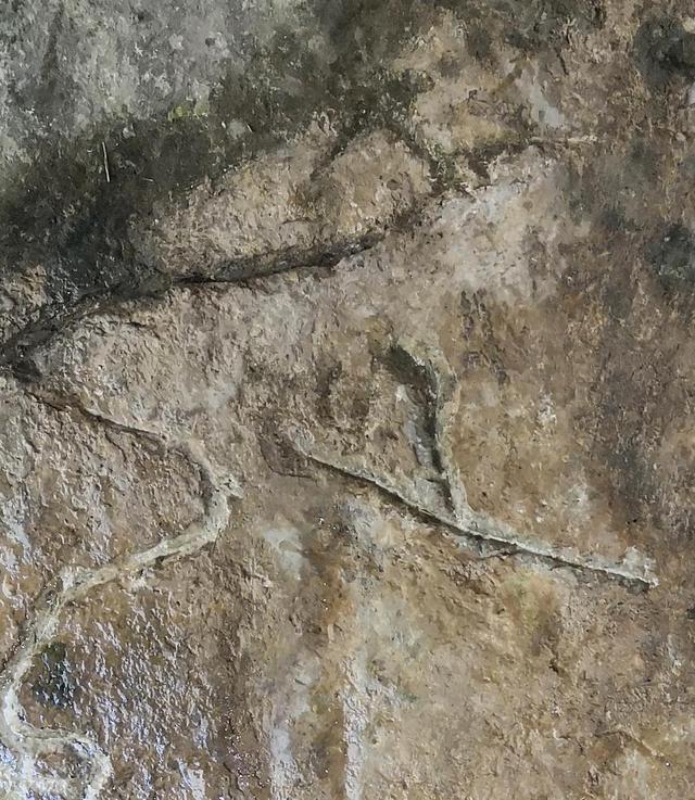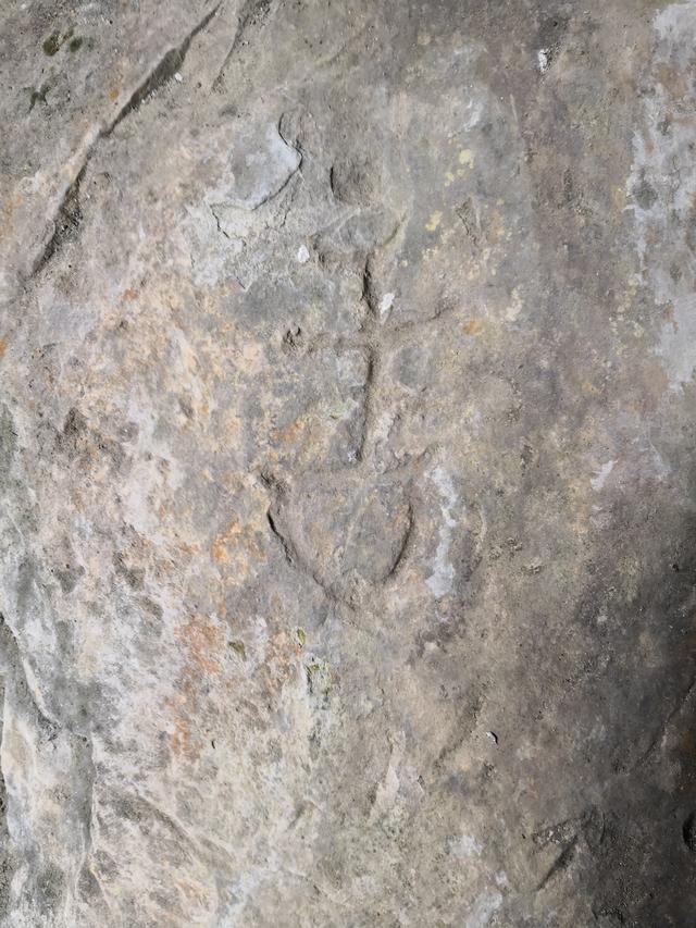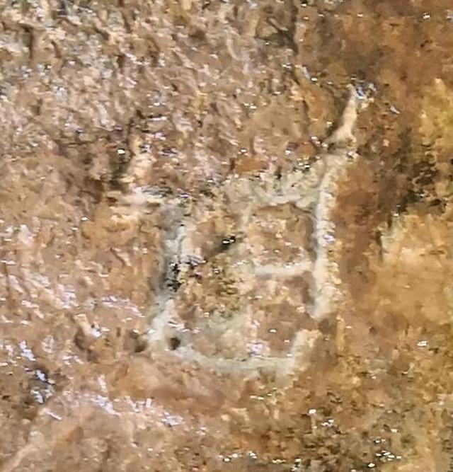 图4“丹”字,与甲骨文 一致。丹,甲骨文为指事字,字形为在矿井中间加一指事符号 ,表示矿井中的矿物。“丹”字在古矿硐中出现,特别是矿硐图右下的那一竖一点的标记,应为金矿或铜矿的具体位置。这些特殊的字迹,后人难立此意并摹刻,故应为殷商或更早时期的原始字迹。