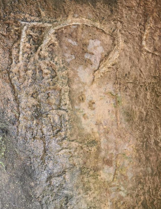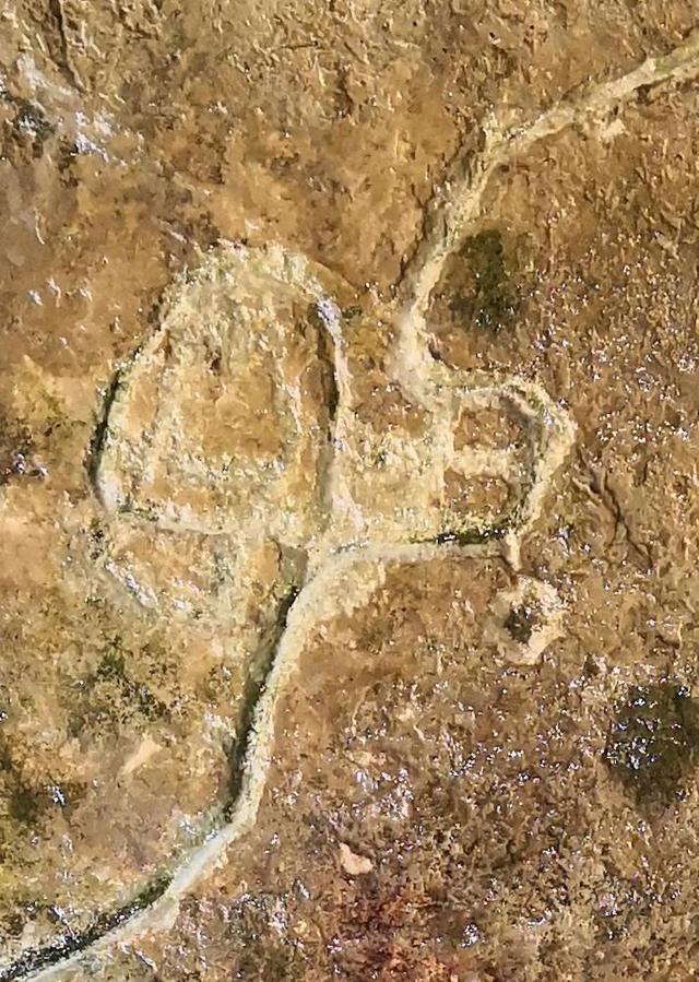 岩画位于成县黄渚镇太山村双窑峡一条小溪东侧的古矿硐口。硐口高约5米,宽约6米,深不可测。硐体为千枚岩,硐内因地质变迁涌入大量黄土,高处板结成岩。岩画即刻在黄褐色硅质岩的一处斜坡面上(见图1)。