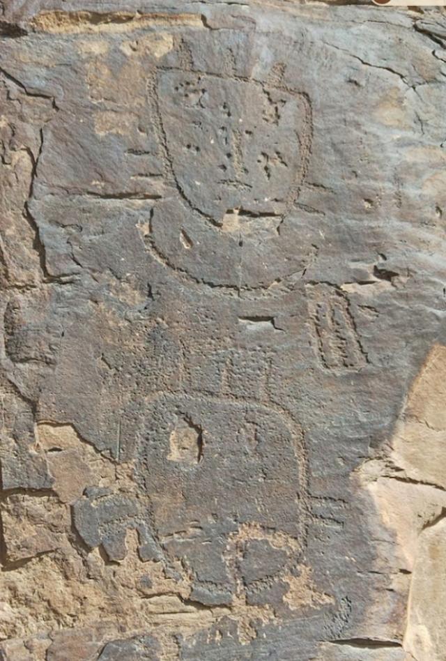 岩画分上下两块,左上为散点状文字和人像图刻,右下为密集的岩画图式,纵宽3米,高2.5米,分布面积约8平方米。岩画中能够辨识的文字、图形和符号有:甲骨文“告”(见图2)、变形表意字“禺”(见图3)、甲骨文“丹”(见图4)、面像画和变形表意混合文“父”(见图5)、疑似金文“鼏”(见图6)、魏体“大地”(见图7);魏体“天下”(见图8)、魏体“杨忠元”(见图9)、疑似“斗”字(见图10)、疑似简化字“龙”(见图11)、人形符号(见图12)、平顶侧身人像画(见图 13)、塔形画(见图 14)、人物坐像画(见图15)、冠饰及珠宝状符号(见图16)、植物和“龙须”状图画(见图17)、矿硐图(见图18)、龙形和弓箭图(见图19)、巫形图(见图20)、觋形图(见图21)。