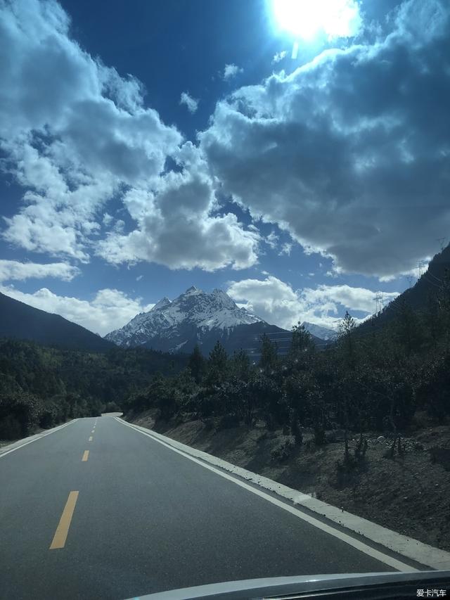 这不,这才是我喜欢的,这边还是阴天,下山了晴天,蓝天白云和远处的雪山!(下山路有的路段结冰,对于一辆商务车来说,我们只能慢慢开,慢慢开。记得18年10月1去亚丁的好多因为下大雪堵半路上好几天!这路下大雪车一多100%堵!