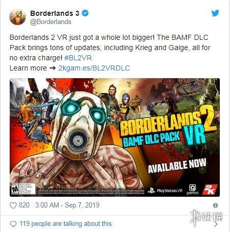《无主之地》官方推特正式宣布《无主之地2(Borderlands 2)》VR版“BAMF”DLC扩展包将于今日正式更新,官方表示本次的DLC包含很多内容,足足有16个额外内容,并且这个DLC将免费提供给所有玩家,一起来看看吧。
