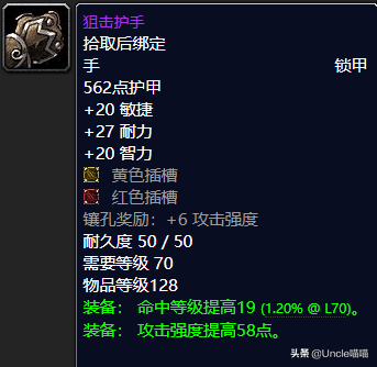 这款锁甲护手的话前期对于我们的猎人玩家来说真的是良心之作了,一流敏捷超强耐力高端智力已然不俗,而红黄双插槽附送6点攻击强度搭配上自身的稳定58点攻击强度提高可谓非常的恐怖如斯,而最为关键的是那让人流口水的19点命中等级提高可谓是非常的NICE,值得推荐,推荐指数满天星辰之戳天花板。