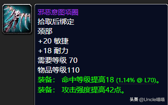 试问初期P1阶段的BIS巅峰物理系输出项链是哪款?那么这款邪恶意图项圈毋庸置疑是最为巅峰的存在了吧,甚至很多需要力量的战士输出玩家也是奉为手上至宝,可见一斑。20点的敏捷已然超一流,18点的耐力可谓让人心旷神怡,重点是18点的命中等级提高对于前期的物理输出来说真的不要太友好,而42点的攻击强度提高对于项链来说已然巅峰水准,推荐指数满天星辰之戳天花板。我戳我戳我戳戳戳!