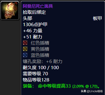 这款极具祖阿曼风格的面具可以说是很多战士玩家的心头好了,当时的话这款头部装备的话也是非常的棒的,虽然没有攻击强度的加持,但是那恐怖如斯的46点力量已然让玩家没话说,红黄蓝三色插槽的加持附送6点耐力也给你提供了良好的输出血线保障可谓不错,最重要的是那天花板水准的史诗级33点命中等级提高让玩家直接尖叫起来,堪称极品,推荐指数满天星辰之戳天花板。