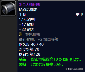 专业的护腕堪称喵叔的经典记忆,刺杀大师必备的东西,作为专业的贼玩家你怎么可以不去拥有这款经典自带黄色插槽附送2爆击等级提高的高暴击护腕呢?推荐指数满天星辰。