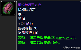 这款阿拉希督军之戒的话喵叔个人觉得对于战士玩家还是挺友好的,23点的爆击等级提高可以说在前期也是非常NICE的加持了,46点的攻击强度的话必然优秀,无非是属性方面的话只是简单的加了些许的耐力可谓是美中不足,然而还是很多物理系玩家在缺乏爆击等级的时候去拥有这款经典的戒指,推荐指数10颗星。