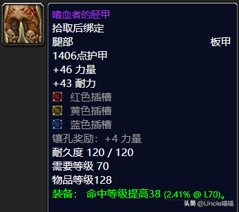 这个阶段的兑换的装备可以说是命中非常的可观,你看这件板甲腿部装备就可以知道了,38点的命中等级提高堪称史诗级的巅峰水准,力量耐力都非常的不凡,红黄蓝三色插槽也是绝对的可以,如果板甲里面让喵叔优先选择的话那么这条裤子是非常值得入手的,推荐指数满天星辰之戳天花板。