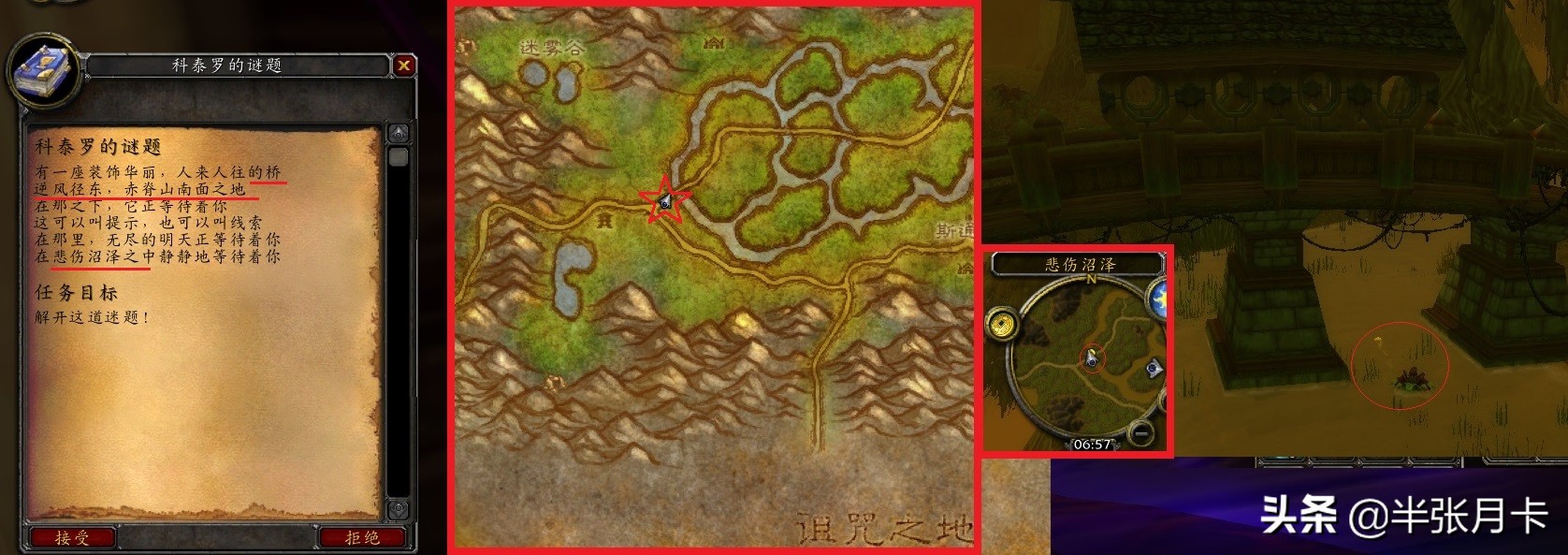 接了任务后,就要开始跑断腿了!第一步给出的信息很含糊,只是说找“桥”!但你自己看任务描述就可以知道,是让你去【悲伤沼泽】里去找。