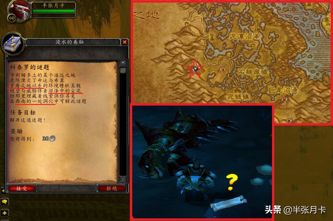 然后开始第二步,让你去卡利姆多大陆,还要在贫瘠之地的东方,还有沼泽和尘泥!肯定就是【尘泥沼泽】啊!在该地图左下角的迅猛龙洞穴中,顺利找到第二步的宝箱。