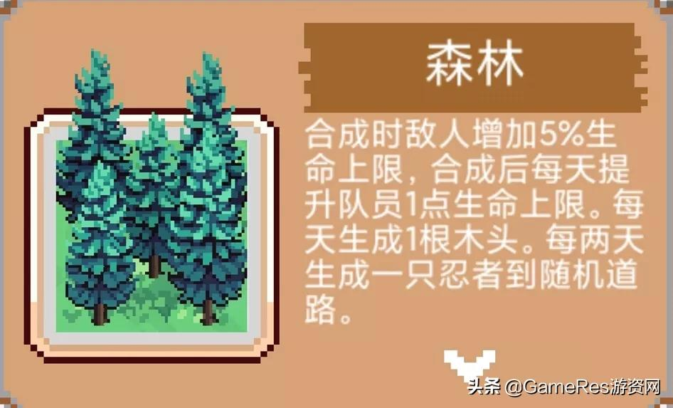 高级建筑物森林,合成升级条件比较苛刻,但能获得比较重要的物资木材,也能强化我方生命值上限