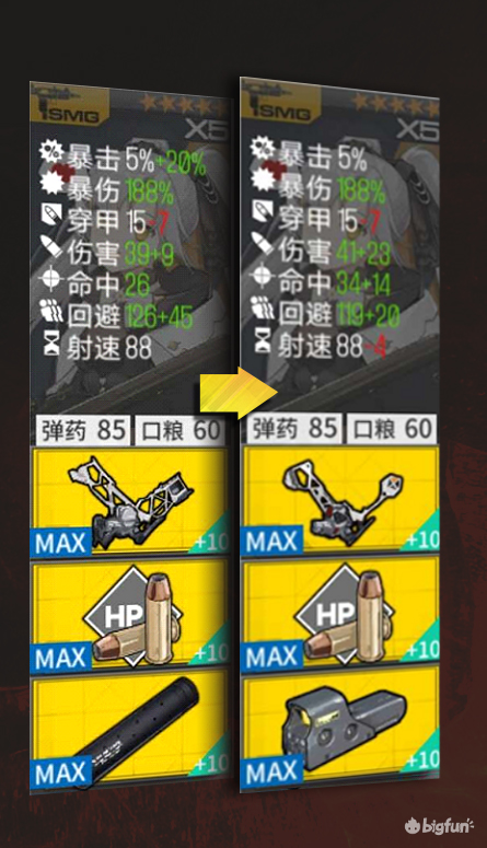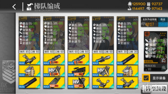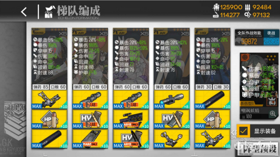 比较需要注意的点在于,如果想让她打出更高的输出,需要堆的光环并不是火力,而是回避,射速,暴击等,而想让她变得更能抗,则需要堆砌一定的命中与火力。