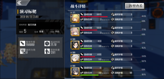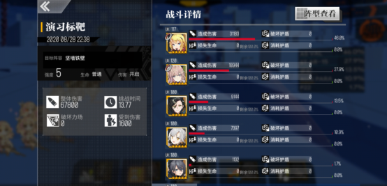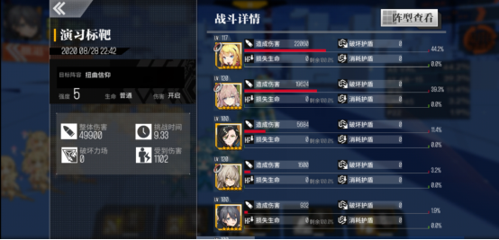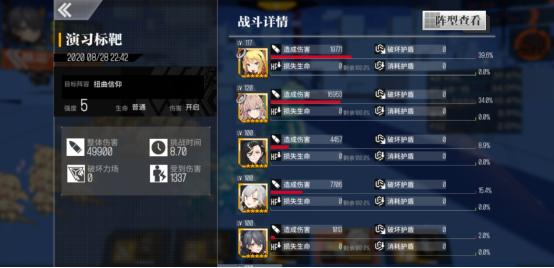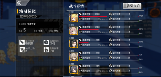 可以对比发现,在野战中面对高甲单位,高配梯队中augpara发挥的效果并不比ump45差,两者区别在于ump45更多的抬高了队友的输出,而augpara则是自身提供了一定程度的输出。(注:此处45的战损为手操失误结果,实际可以避免。)