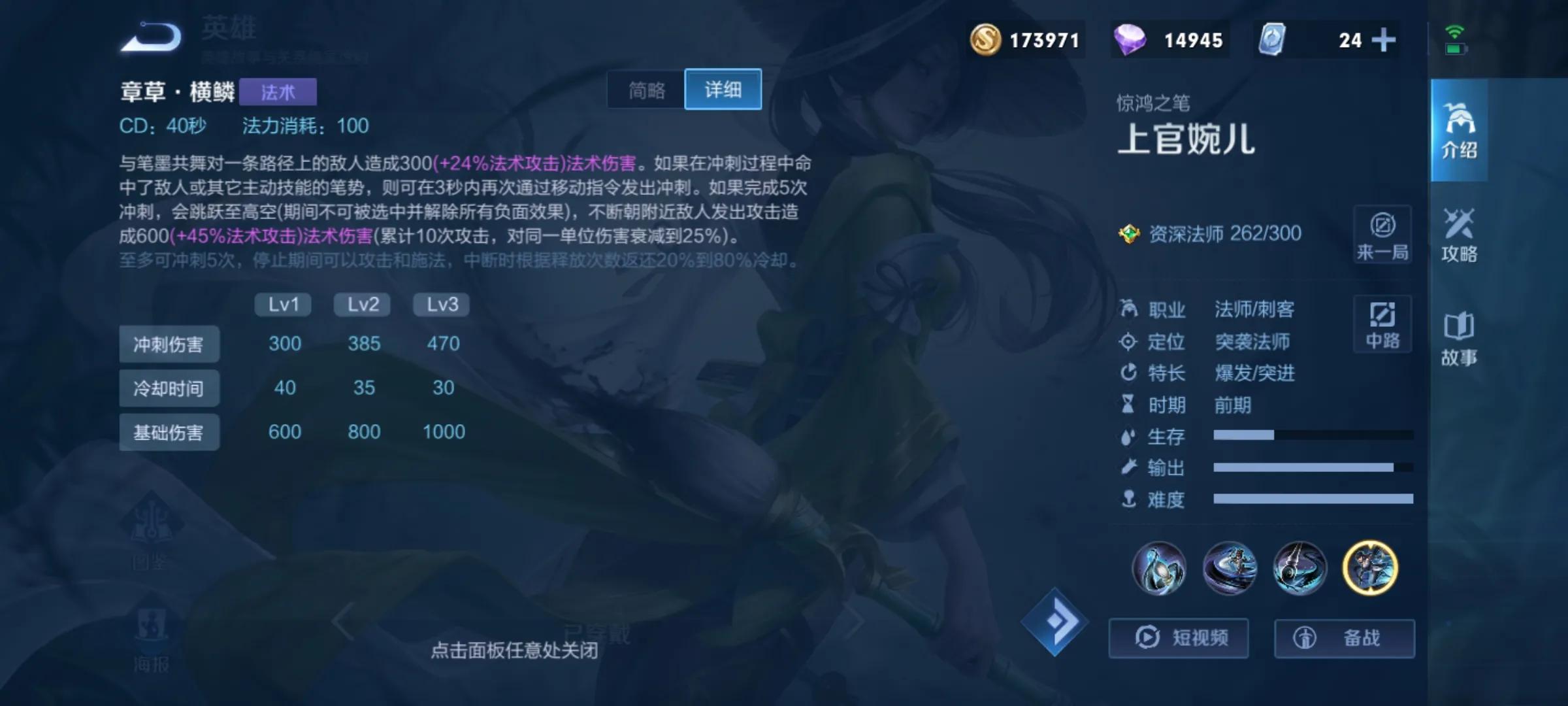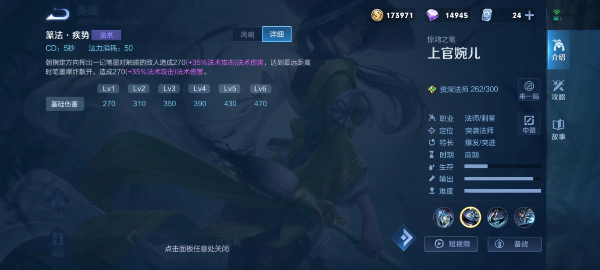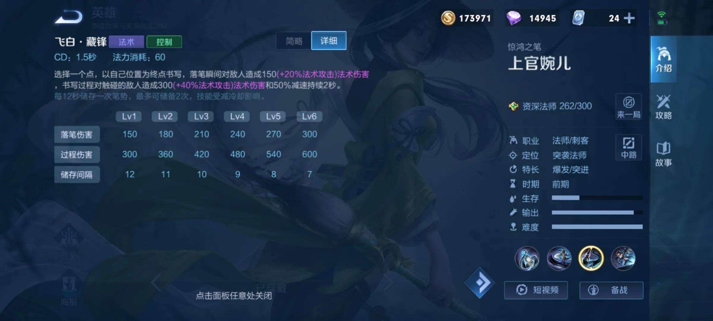上官婉儿的定位是法师刺客,是一个可以和露娜一样秀的英雄,加点推荐主2副1,有大点大!团战的时候可以先使用1技能进行远程消耗,然后找准机会开启大招入场,结合2技能笔墨路径,来回穿梭,打出大招飞天无敌效果,击杀敌方C位。上官婉儿的大招一定要注意使用方向键叠加位移,达到5次后才会触发无敌效果!