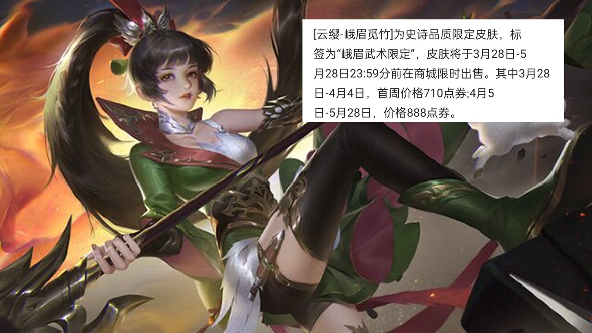 自从之前官方爆料上官婉儿成为了峨眉文化的联动代言人之后。关于她的一款新皮肤正在加急制作中。目前这款皮肤定名为峨眉觅竹,作为一款史诗品质的限定皮肤。这款联动皮肤预计3月28日上线,上线为期两个月。首周710点券,首周过后恢复原价888点券。