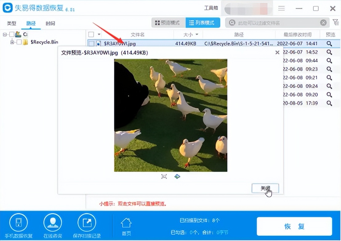 误删照片扫描完成后选择双击预览,选择想要恢复的照片,点击恢复,选择所要恢复渠道,整个过程就完成了。