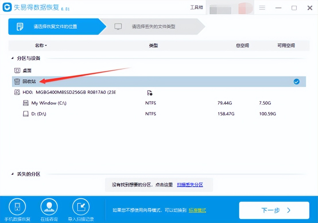 第一步:打开“失易得数据恢复”软件,选择误删除或丢失照片的回收站,