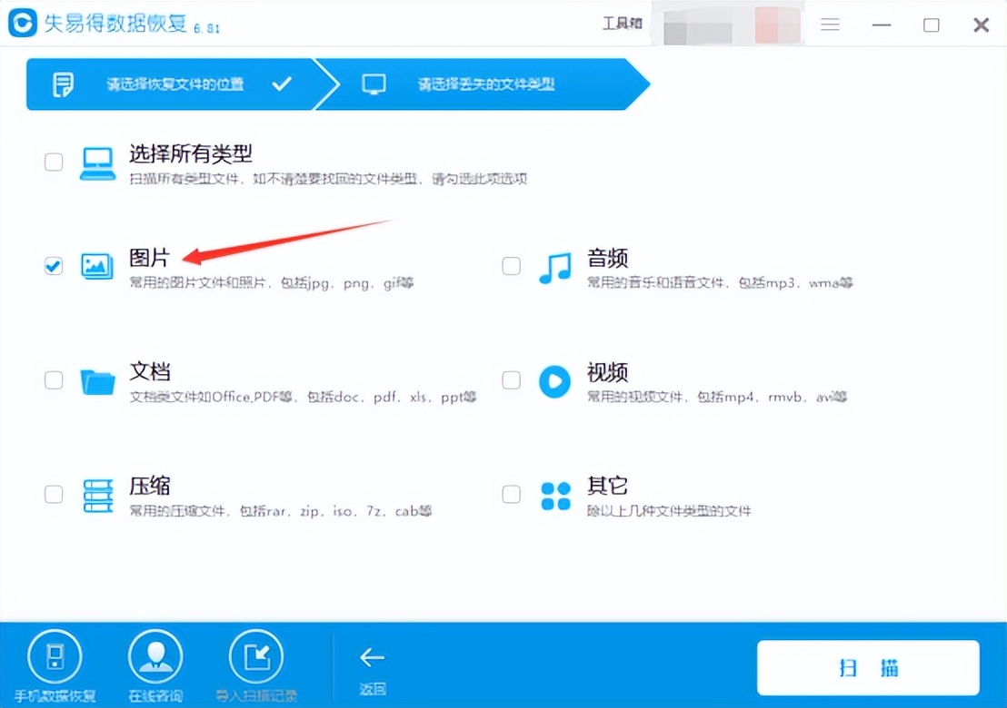 选择图片类型,点击扫描进行误删照片扫描,