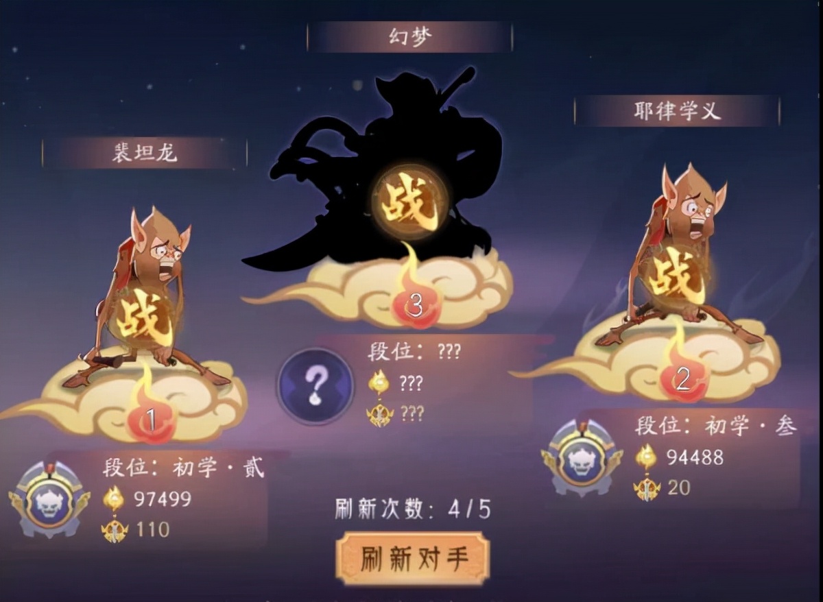 4.每组安排3名对手,每个对手从左至右分别为低、高、中打赢后可获得胜点分别是1、3、2
