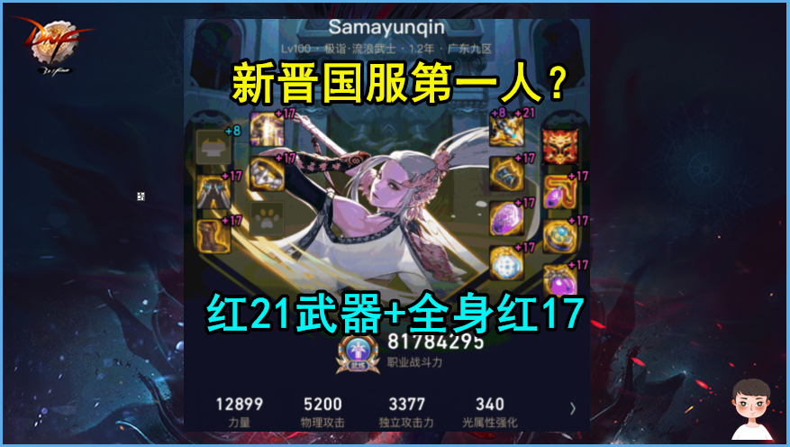 可以看到这是一位来自“广东9区”的剑帝玩家,一身红17不说,最亮眼之处在于,手拿一把红21神之意象,比似雨幽离手上的还高出一个等级,虽然说只是高了一级,但增幅等级越高,差距越好,20和21之间可以用“天壤之别”来形容。