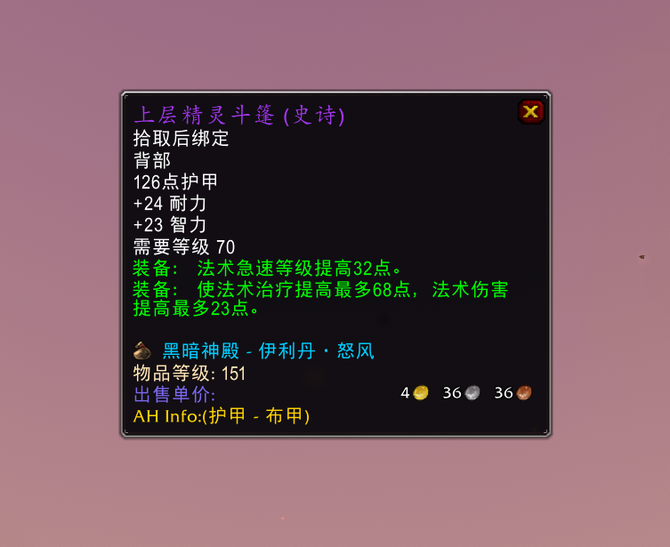 到了TBC版本跨职业购买装备也是时常出现,前天又碰到了一次跨职业购买装备,而且是非常理直气壮地跨职业购买装备。上层精灵斗篷大家应该都知道,是P3阶段治疗职业的毕业披风,前天打黑暗神殿伊利丹掉落了上层精灵斗篷,结果最后拍卖的时候却没有一个治疗职业出价,全部都在看几个法系职业竞拍。