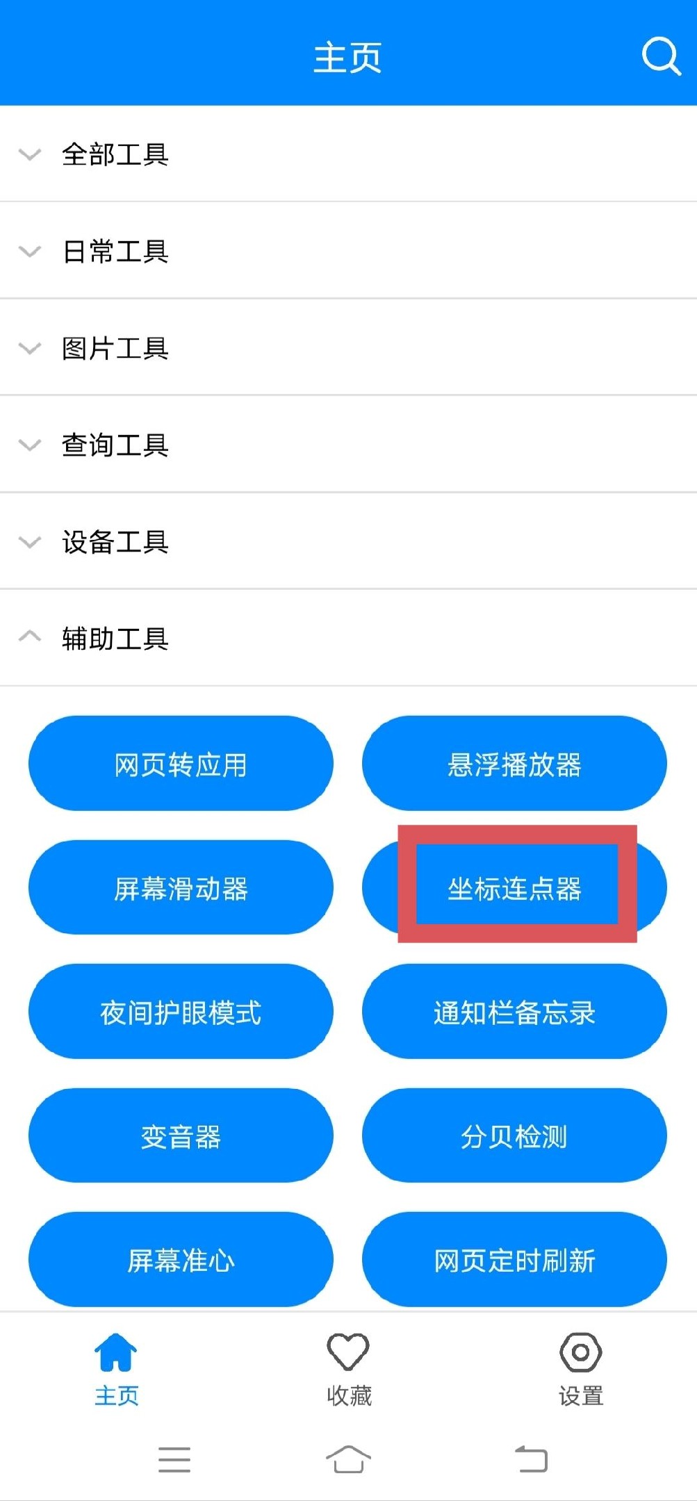 1.首先我们去手机应用商店搜索<实用工具箱>软件下载,然后找到辅助功能-坐标连点器功能,如图所示: