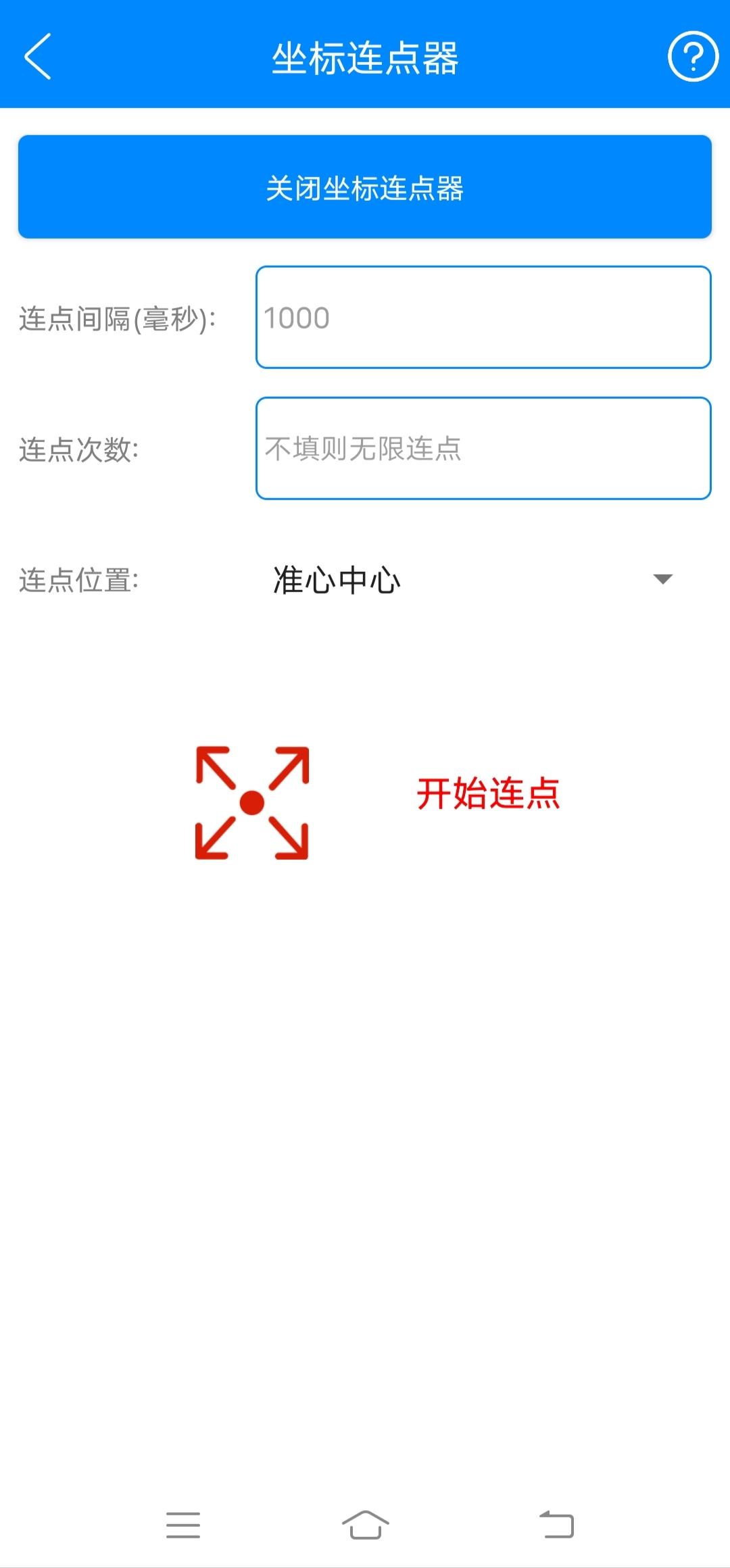 3.我们点击开启坐标连点器按钮,然后可以看到,屏幕上出现了一个坐标图片和开始连点按钮,我们只需要拖动坐标图片到指定的位置后点击开始连点即可进行自动连点了,是不是非常的方便快捷,快去试试吧~