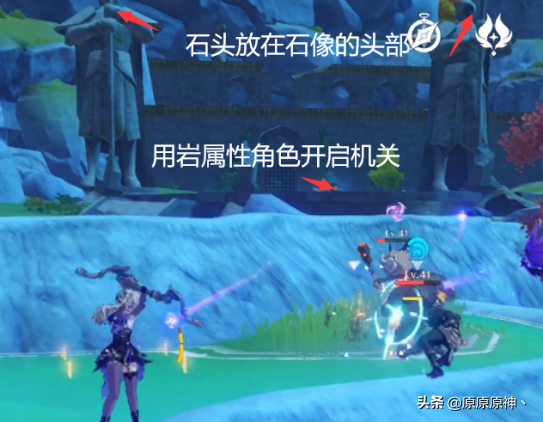 找到石头后,回到任务原点,找到面前两座巨大的石像爬上去,将找到的石头放入头部,即可开启任务机关