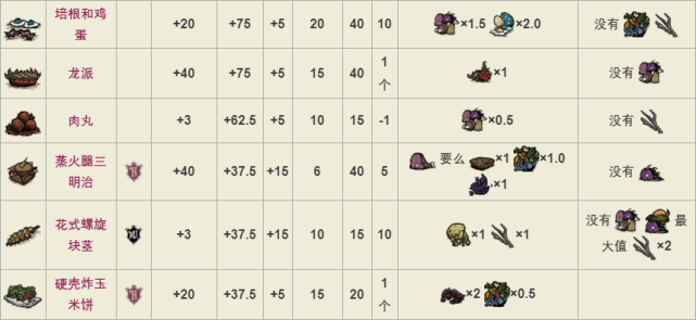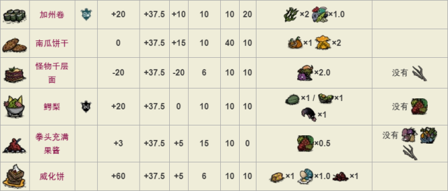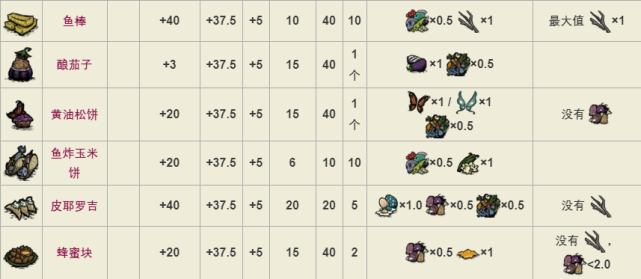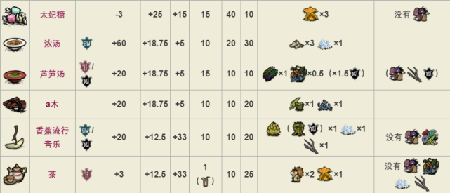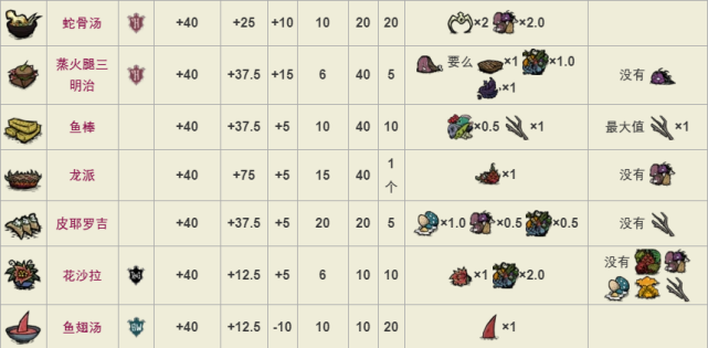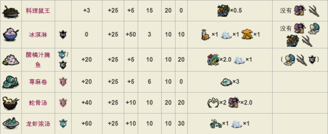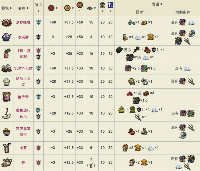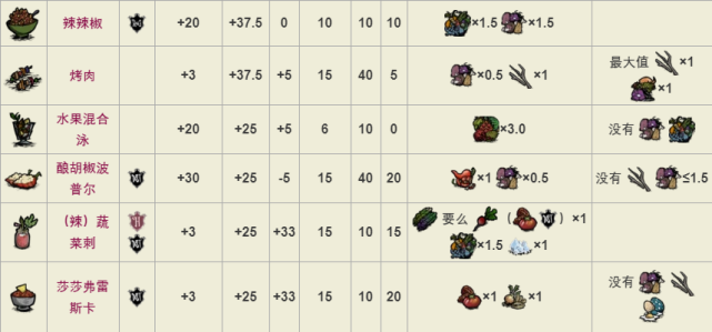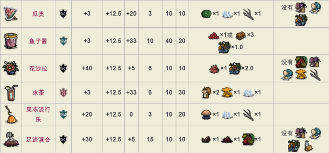 上图种(辣)蔬菜刺需要的是芦笋/萝卜/番茄中的1个,奶油土豆泥需要的是土豆、大蒜,鱼子酱需要的是鱼子/熟鱼子,香蕉冰棒需要的是香蕉/熟香蕉,莎莎酱需要的是番茄和洋葱,茶需要的是松鼠。