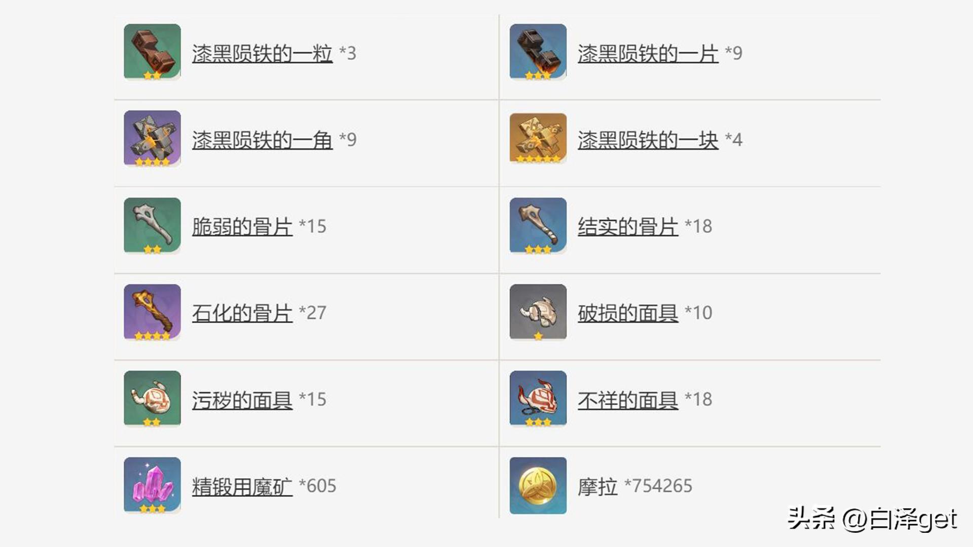 还要提醒大家的是试作星镰的突破材料有这些:漆黑陨铁的一粒,漆黑陨铁的一片,漆黑陨铁的一角,漆黑陨铁的一块,脆弱的骨片,结实的骨片,石化的骨片,破损的面具,污秽的面具,不详的面具,精锻用魔矿,摩拉。小伙伴们记得去收集哦,拜了个拜。