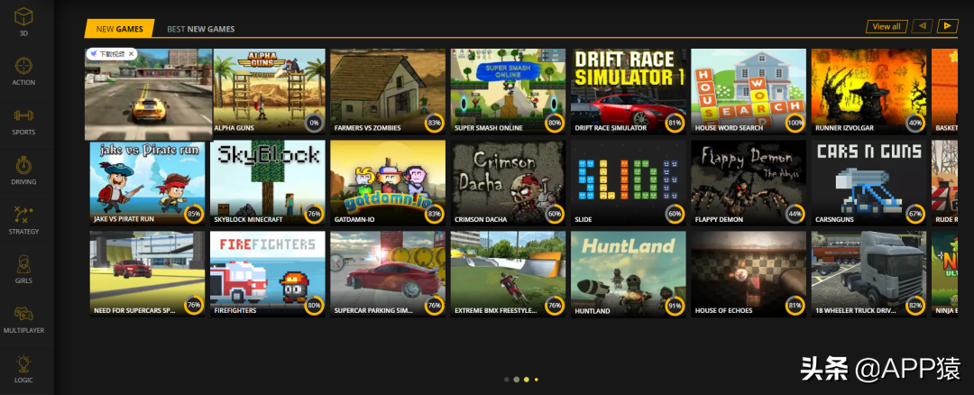 【pacogames】,国外一个类似于4399的免费游戏合集站点,但3D类型的非常多,画质也很不错,游戏库很丰富包括3D、行动、运动、驾驶、战略、多人、逻辑等等,另外站点有个很有趣的地方便是鼠标放在游戏上还可以看到预览。