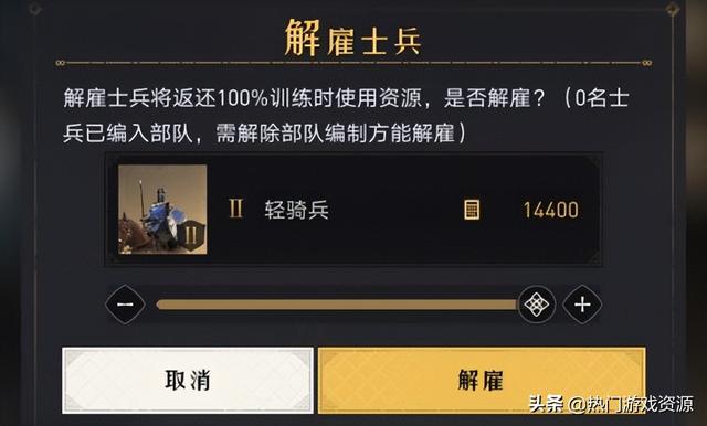 【小提示】初期食物资源田满足主线任务需求即可,无需过多,如果发生食物不够训练士兵的情况,可以前往校场对不参战的士兵进行解雇处理,100%返还对应的食物,基本能满足开荒消耗。