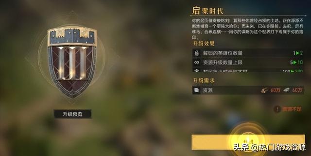 在遵循城镇中心优先的升级原则下,第二天就能开启启蒙时代,此时可以上阵第3名英雄,升级3级士兵,整体实力发生质的变化,开始朝6级资源田发起进攻。