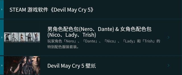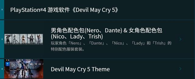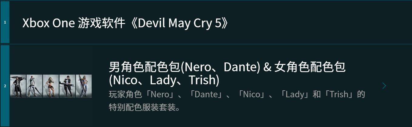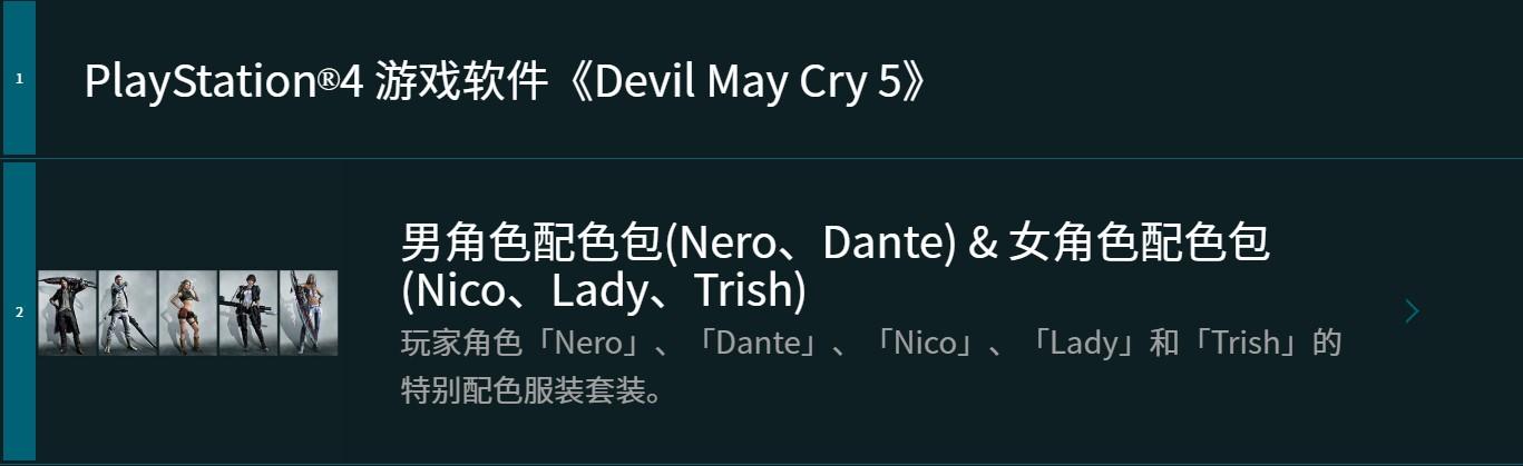 男角色配色包(尼禄、但丁) & 女角色配色包(妮可、Lady、翠西):玩家角色「尼禄」、「但丁」、「妮可」、「Lady」和「翠西」的特别配色服装套装。