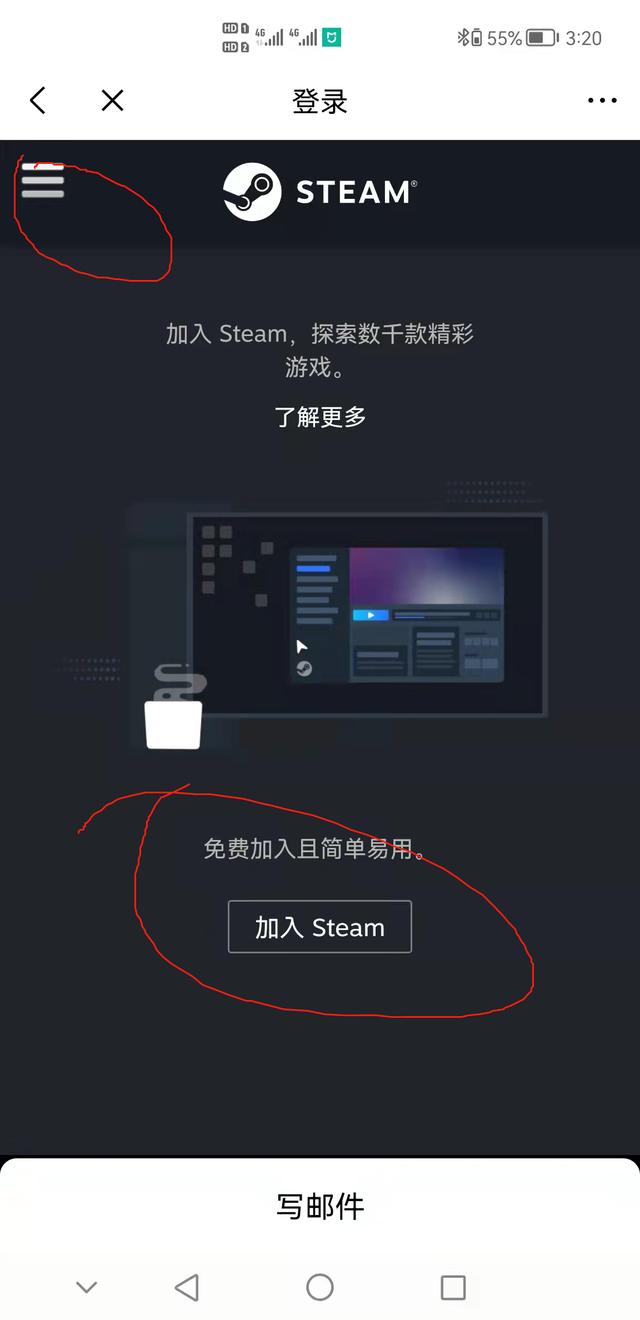 点击左上角的三横线,然后点击登录,然后找到最下边的加入steam