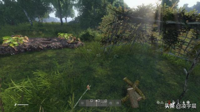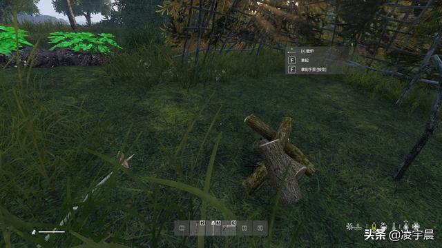 继续前进,我找到了一块略为平坦的河畔。砍倒几棵树后,我用绳子和树枝搓了简易庇护所的地基,但制造这个庇护所需要五十根树枝才能搭建。如果有兽皮或防水布,搭建庇护所会轻松很多,但目前手无一物的我只能用最土的方法了。