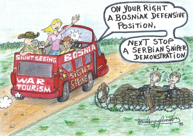 一副讽刺战争旅游的插画,名为:新时尚。画面描述的是1995年波斯尼亚冲突,一堆西欧游客路过前线。