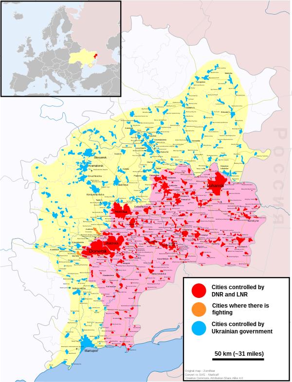 2021 年 11 月的乌东地区局势:红色地区为亲俄武装控制的地区;黄色及蓝色地区为原先曾被亲俄武装控制,但随后被乌政府军重夺的地区;橙色地区为双方当前交战及对峙的地区。