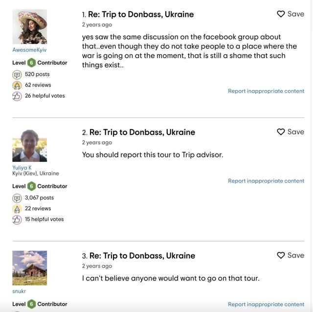 在某些旅游网站的顿巴斯之旅(乌东冲突地区)的评论下方,很多乌克兰用户因为战争游客们建立在自身苦痛上的好奇心而感到愤怒。