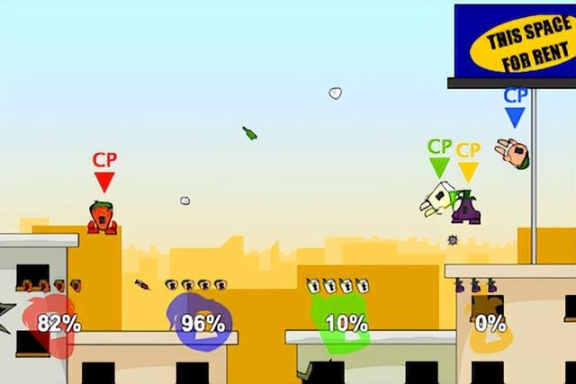 核心玩法很容易就能联想到《任天堂明星大乱斗》,玩家可以选择不同角色,通过攻击累计击飞值,最终将敌人击飞出平台来取得胜利。