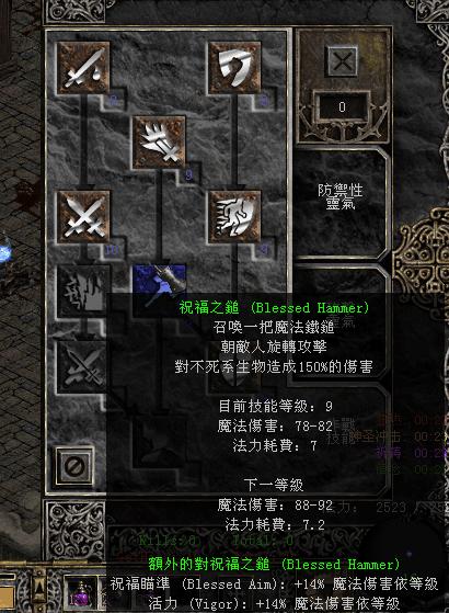 技能出除了路过技能1点,肯定是祝福之锤和对它有加成的祝福瞄准灵气、活力灵气三个都加满,另外还要点满的就是输出的时候要开的灵气——专注灵气,早期的暗黑2祝福之锤属于物理伤害,专注可以提供加成,虽然后来的祝福之锤改成了魔法攻击,但是这个加成没变过,专注灵气是唯一可以给祝福之锤这个法术攻击提升伤害的,别的法术攻击(比如法师的暴风雪和死灵的骨矛)都没效果。所以知道为啥骑士被称为亲儿子了吧!