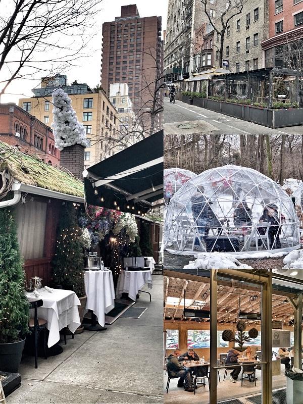 图5:疫情期间不允许室内用餐的纽约餐饮百态。左:2021年1月22日,曼哈顿的麦迪逊大道上,维科丽娜餐厅搭建的豪华版临时木屋,几乎碰上了从餐厅本体伸出来的雨蓬。右上:2021年1月22日,纽约餐饮时尚地标熨斗区,临时搭建连成了排,但吃客寥寥。右中:2021年2月14日,史泰登岛上的艾记(Egger’s)冰激凌店用因纽特人的“圆顶冰屋”(Igloo)为创意,在户外搭建的“情人节”食客区域,45分钟场租30美金,网上预定火爆。右下:2021年2月23日,一家做街坊生意的小吃店外,工人们正在临时搭建里吃着店里提供的快餐。