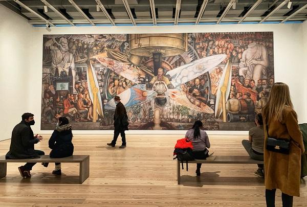 图6:2021年1月28日,惠特妮博物馆。观众穿着大衣、戴着帽子和口罩,参观墨西哥壁画特展。背景是迭戈·里维拉(Diego Rivera)的《人,宇宙的控制者》,原作现存墨西哥城美术宫。这幅壁画原名《十字路口的人》,是1933年迭戈应邀在纽约的洛克菲勒中心的墙面上绘制的,里面有列宁等社会主义者的头像。洛克菲勒要求迭戈删除遭拒,洛克菲勒结清润笔,结束了合同。后该墙画被毁。迭戈随即回墨西哥,在贝拉宫美术馆墙上重绘了这幅画。于历史于现实,这幅画都值得再三玩味。