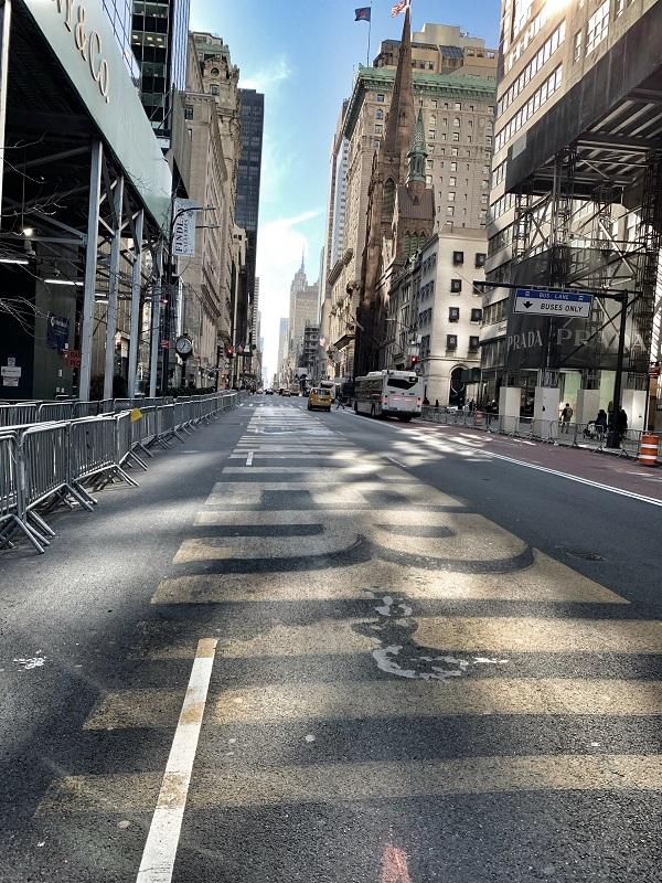 图7:2021年1月28日,纽约第五大道上移除护栏后的“黑命贵”标语。这条标语是2020年7月由纽约市长带领刷在地上的,之后长时间不允许人车通行。旁边是刚刚恢复营业的蒂凡尼旗舰店。