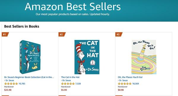 图10:2021年3月6日美国亚马逊网站截屏。在“苏斯博士”系列中的六本童书遭禁后,亚马逊热销书排行榜有7本“苏斯博士”绘本升至前十名,且稳稳占据了前三榜单。